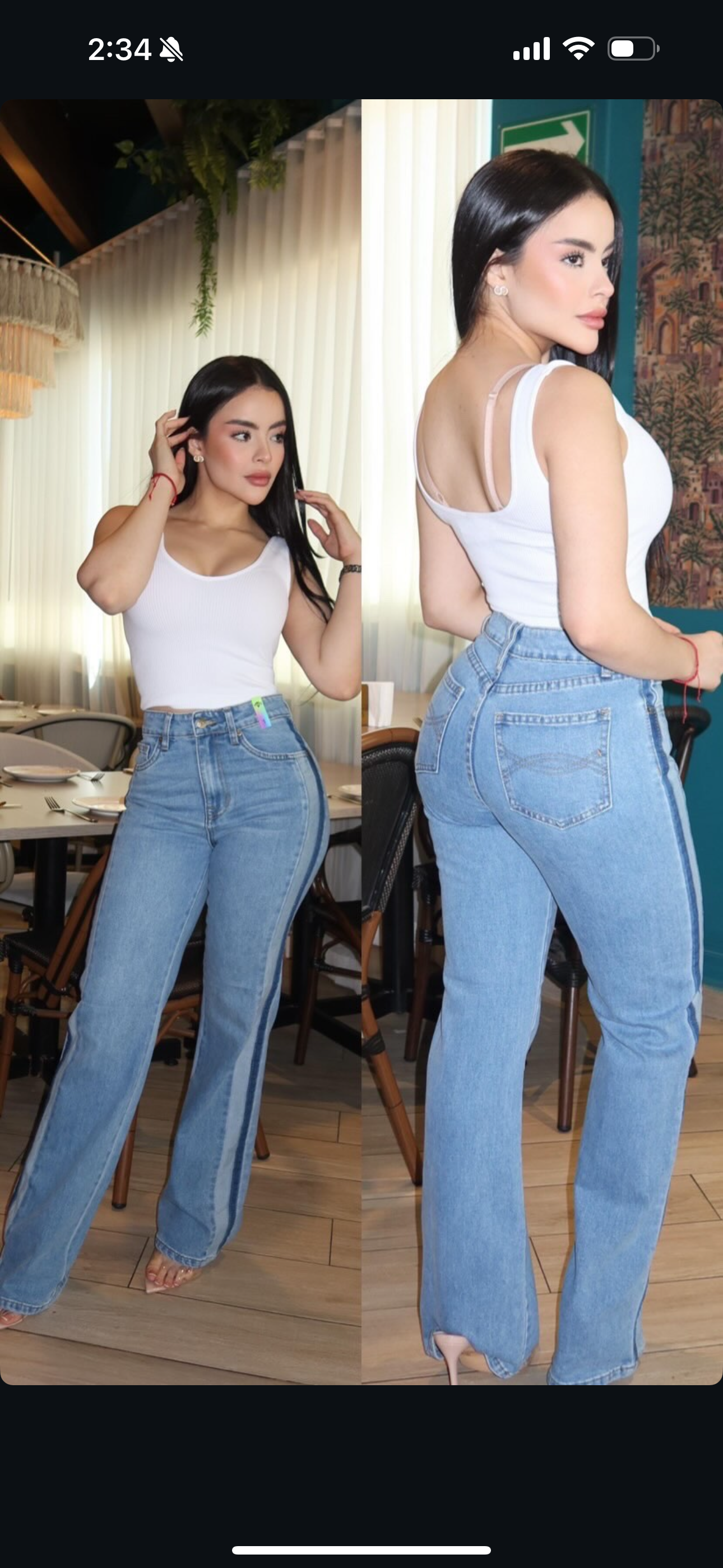 Un par de jeans de pierna ancha y tiro alto , una construcción clásica de cinco bolsillos y un cierre con cremallera.